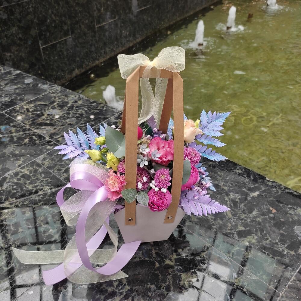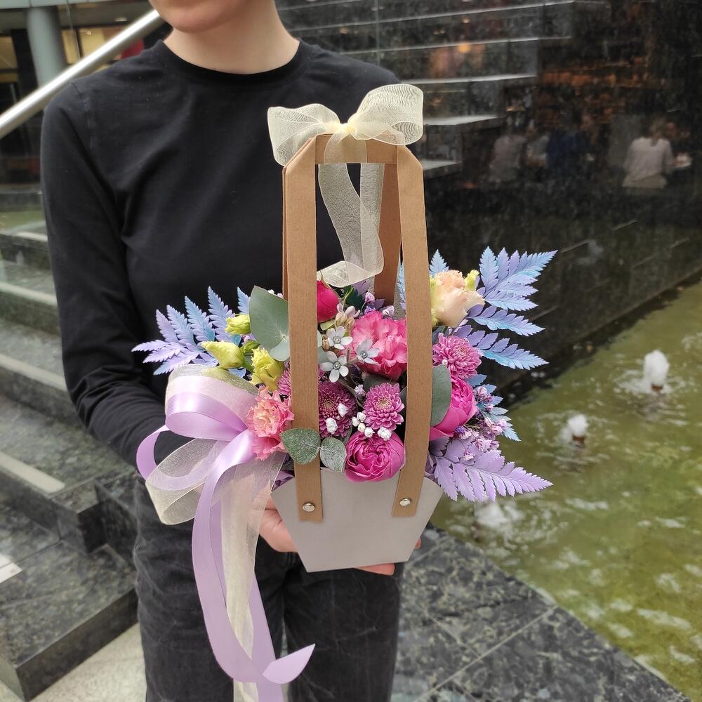 Прекрасная небольшая композиция в картонной сумочке (При заказе просьба обратить внимание на размеры товара)
