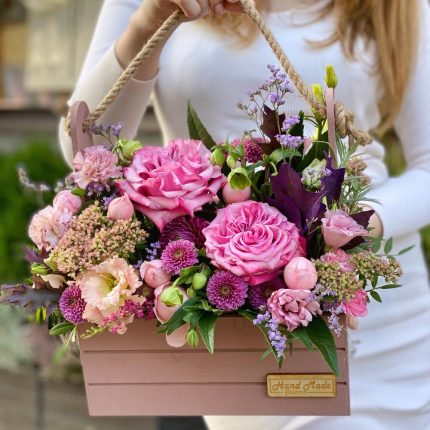 “Атлас☁️” – цветочная композиция с зефиром в деревянном ящике