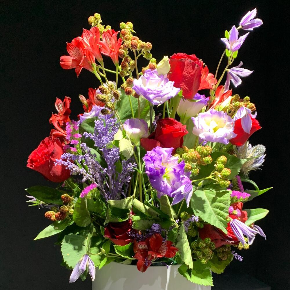 Альстромерия – 3 шт. Статица – 3 шт. Роза – 5 шт. Эустома – 8 шт. Клематис – 5 шт. ветки декоративные – 10 шт.