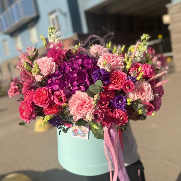 Цветы в коробке с гортензией,пион розами,матиолой,альстромерией,эустомой,колосьями пшеницы и эвкалиптом