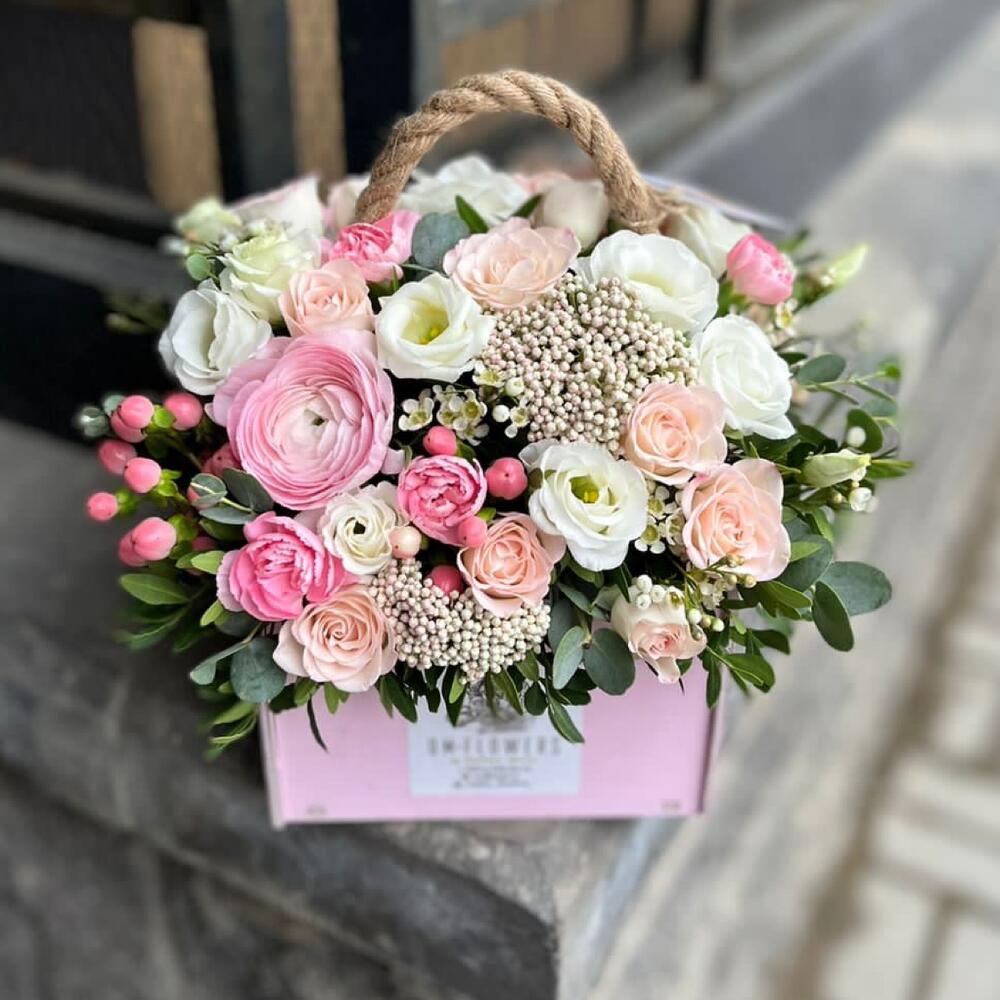 “Атлас☁️” – цветочная композиция с зефиром в деревянном ящике