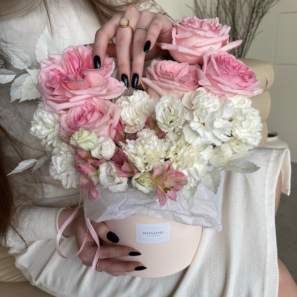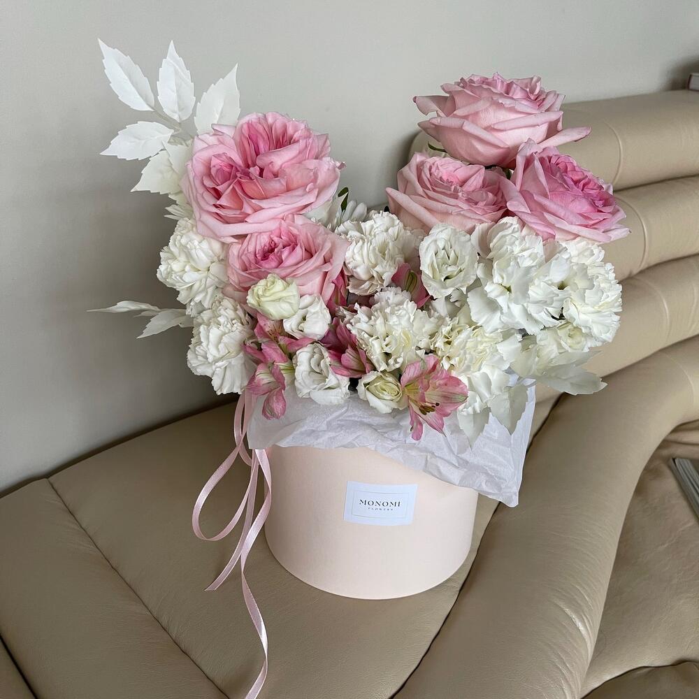 Альстромерия – 2 шт.Хризантема кустовая – 1 шт.Эустома – 2 шт.Лента атласная – 1 шт.Диантус – 8 шт.Фисташка – 5 шт.Шляпная коробка – 1 шт.Оазис флористический – 1 шт.ветки декоративные – 2 шт.наклейка фирменная – 1 шт.роза пинк охара(ароматная) – 5 шт.