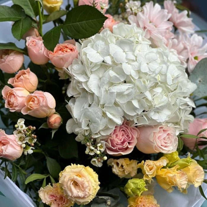 Категорий: Гортензии, Лизиантусы, Пионовидные розы, Розы, Хризантемы, Хризантемы кустовые, Эвкалипт, Эустома