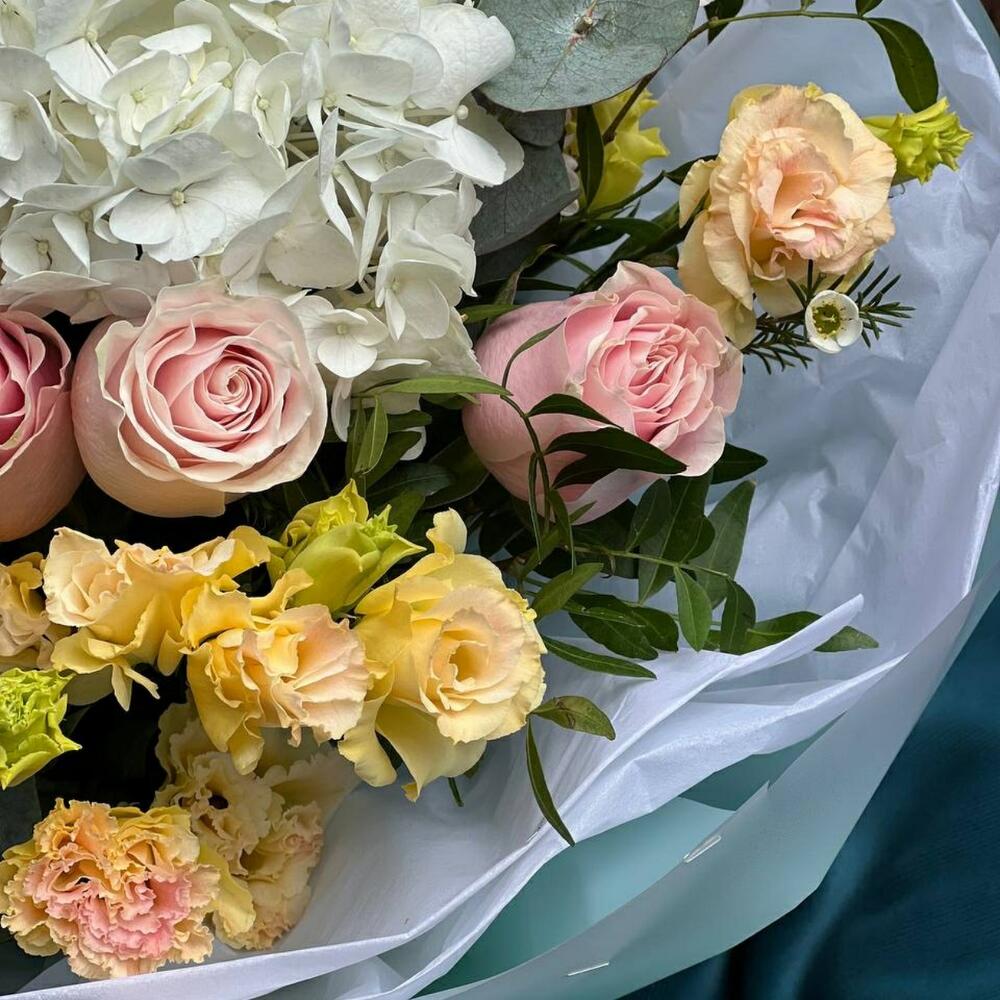 Гортензия – 1 шт. Лента – 1 шт. Хризантема кустовая – 1 шт. Эвкалипт – 3 шт. Эустома – 2 шт. Фисташка – 5 шт. Роза голландия – 3 шт. Упаковка дизайнерская – 7 шт. Роза пионовидная спрей – 3 шт.