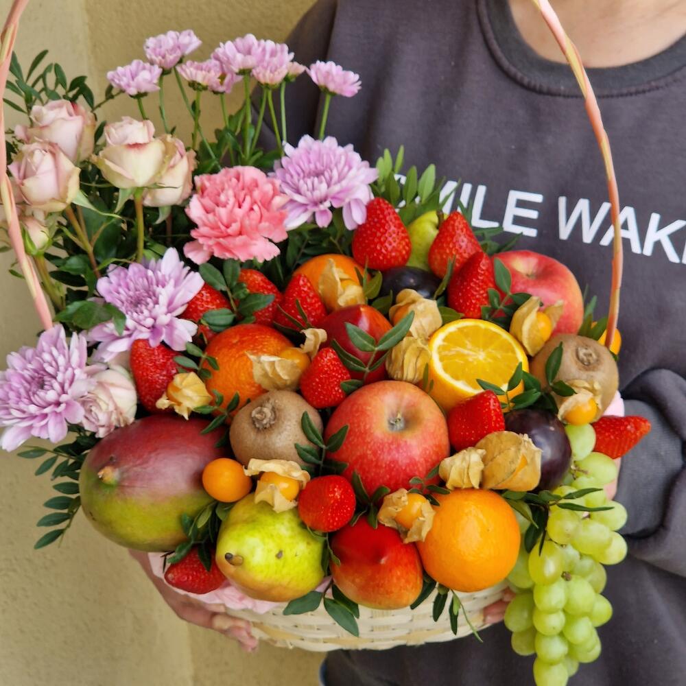 Корзина , в которой прекрасно сочетаются фрукты , ягоды и цветочная композиция.