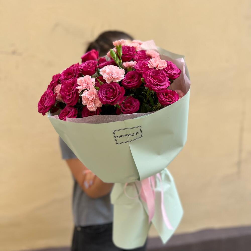 Гвоздики, Кустовые розы, Лизиантусы, Пионовидные розы, Розы