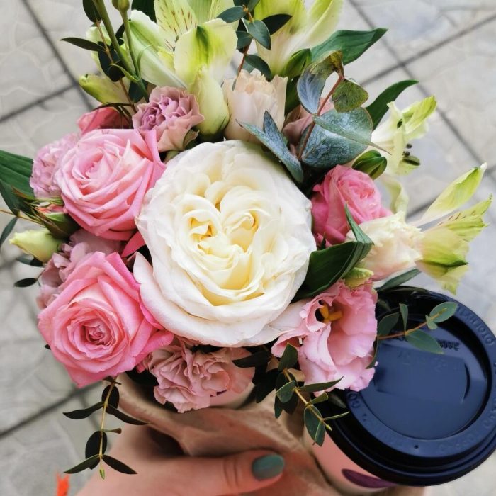 Альстромерия – 2 шт. Роза одноголовая – 1 шт. Роза кустовая пионовидная – 1 шт. зелень декоративная – 2 шт. Капучино – 1 шт.