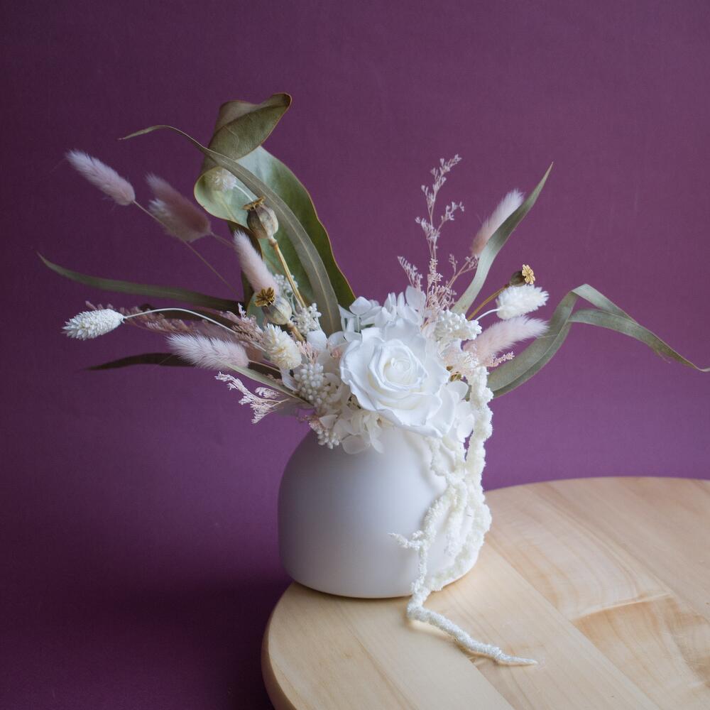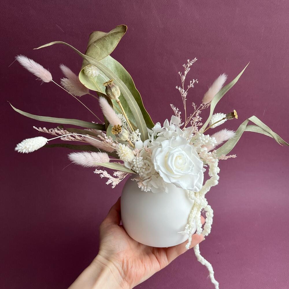 Композиция из сухоцветов и стабилизированных цветов в белом кашпо
