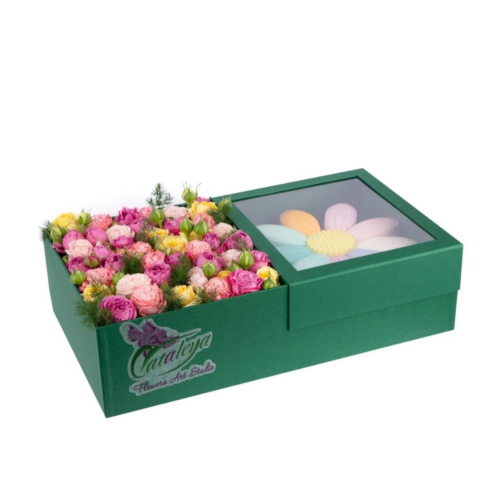 Композиция включает букет и торт.