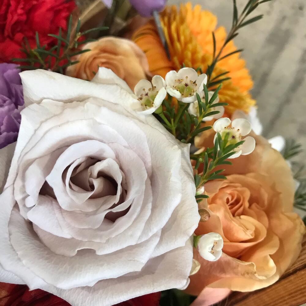 Ваксфлауэр – 2 шт.Статица – 3 шт.Хризантема кустовая – 1 шт.Роза – 5 шт.Гвоздика – 2 шт.Гербера – 1 шт.Ранункулюс – 1 шт.Птица декоративная – 1 шт.Ящик деревянный – 1 шт.фисташкв – 3 шт.декор трава – 5 шт.