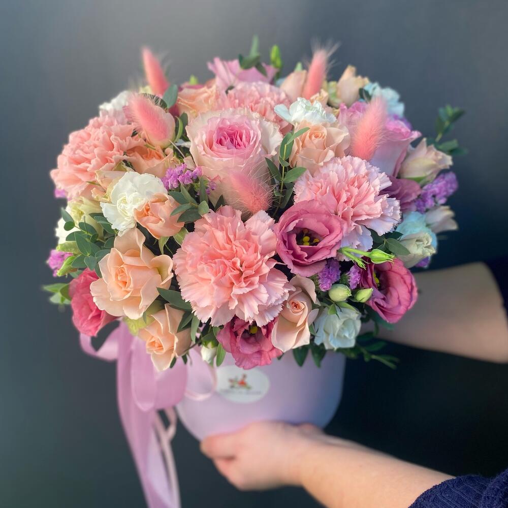 Роза Эквадор – 3 шт.Роза кустовая – 2 шт.ларгус розовый – 5 шт.Лизиантус – 3 шт.Диантус – 4 шт.дианиус кустовой – 3 шт.Эвкалипт Микс – 1 шт.Фисташка – 5 шт.шляпная коробка с губкой – 1 шт.