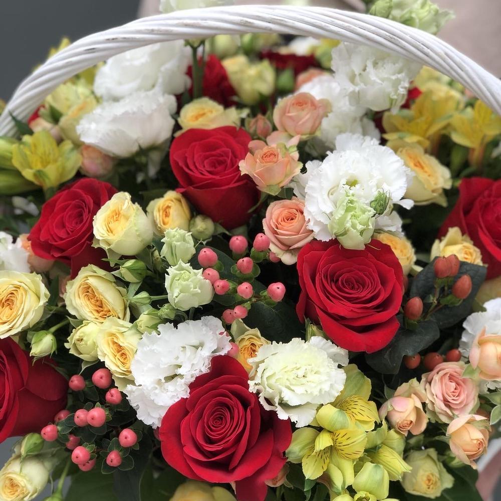 Корзина из роз, эустомы, альстромерии и ягодок гиперикума!