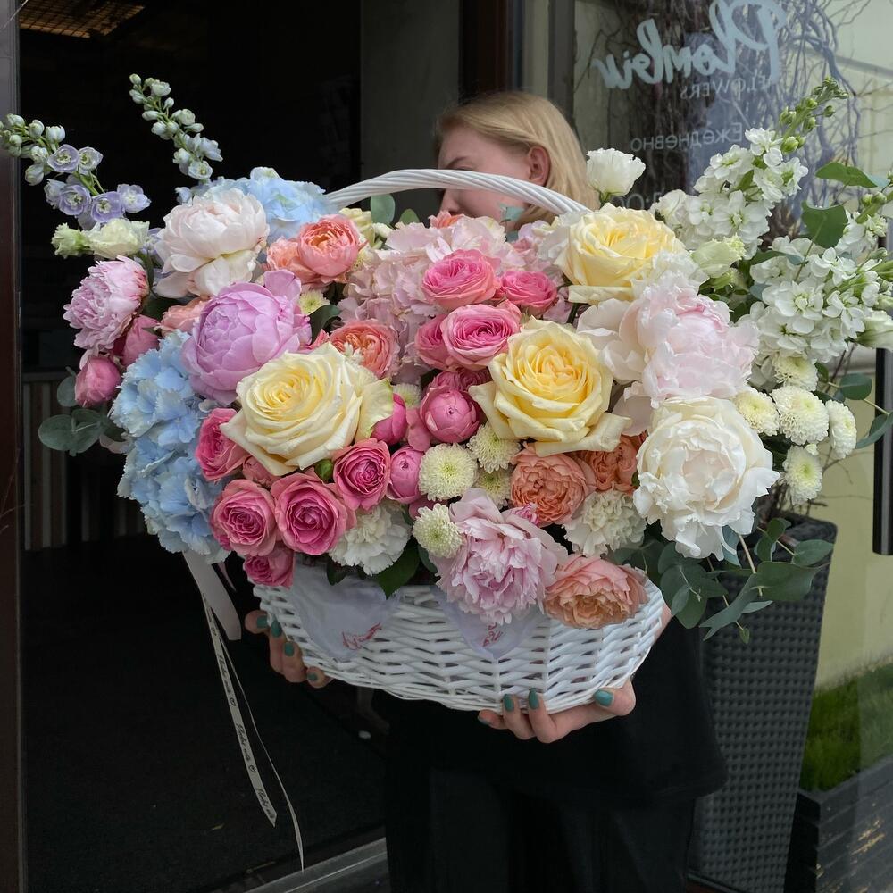 Пион – 7 шт.Гортензия – 3 шт.Дельфиниум – 2 шт.Маттиола – 3 шт.роза пионовидная джульетта кустовая – 7 шт.роза сильва пинк пионовидная – 10 шт.роза кендилайт – 5 шт.Хризантема Сантини – 5 шт.Диантус – 7 шт.Махровый лизиантус – 5 шт.Эвкалипт – 10 шт.Корзина плетеная – 1 шт.