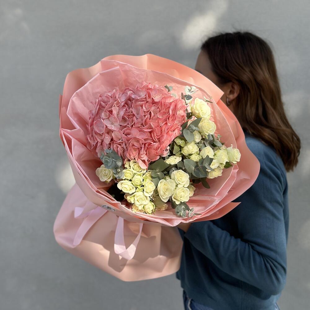 “Эвкалиптическая роскошь” гортензия и пионовидная кустовая роза