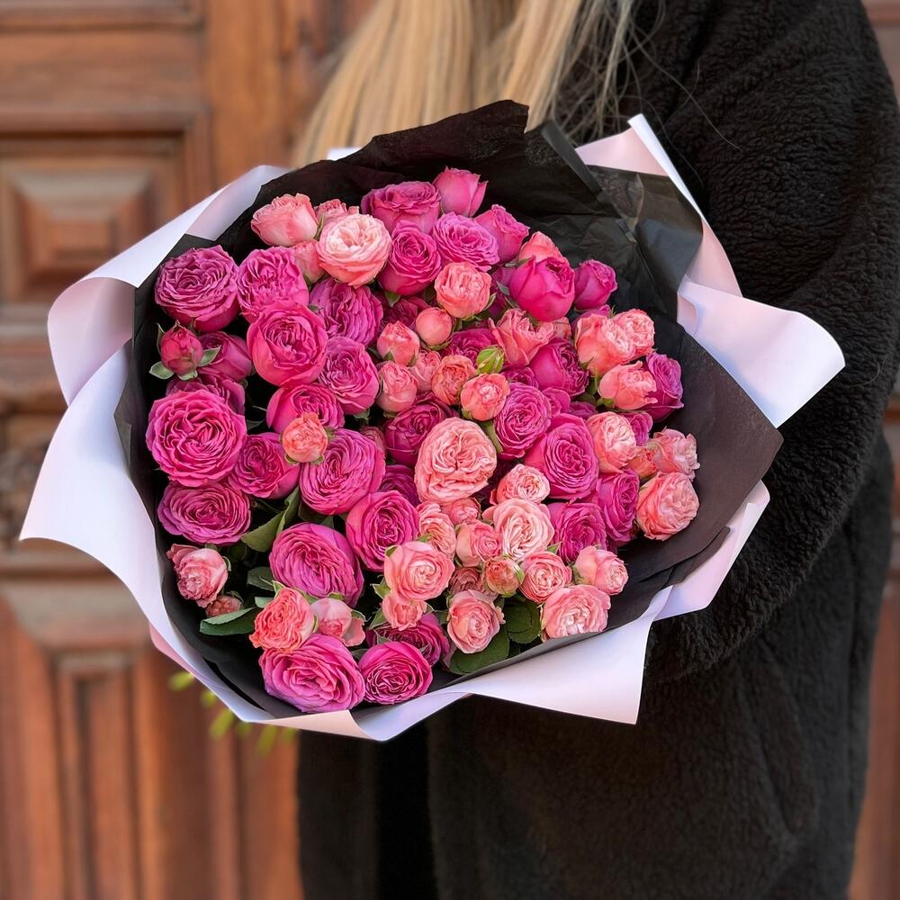 Лента атласная – 2 шт.Тишью – 2 шт.Пионовидная кустовая роза – 21 шт.Пленка матовая – 2 шт.