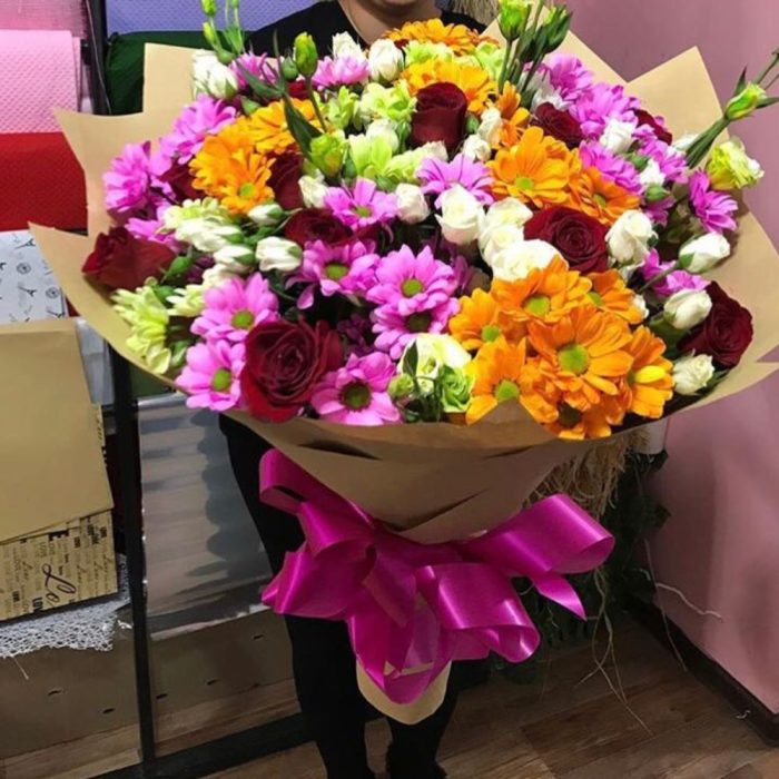 Лента – 1 шт. Хризантема кустовая – 10 шт. Зелень – 5 шт. Крафт – 3 шт. Роза одноголовая местная 60 см – 11 шт.
