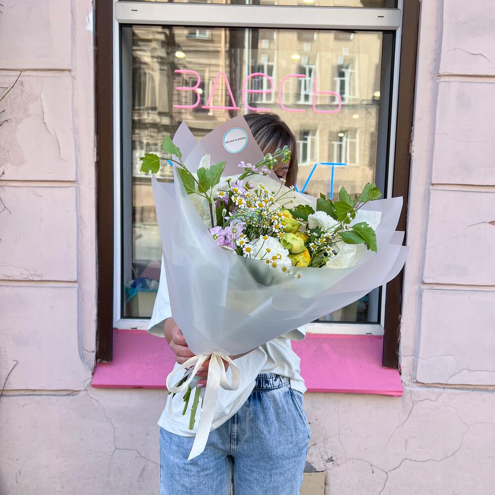 Маттиола – 2 шт.Лента атласная – 1 шт.Тишью – 1 шт.Диантус – 2 шт.Ветки березы – 2 шт.Аквапак – 1 шт.Матрикария (Ромашка Камила) – 3 шт.Корейская пленка – 3 шт.Инструкция по уходу – 1 шт.транспортировочная упаковка – 1 шт.кустовая садовая роза – 1 шт.