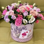 Лизиантус – 3 шт.Кустовая роза – 7 шт.Шляпная коробка – 1 шт.Одноголовая роза – 11 шт.Губка флористическая – 1 шт.декоративная зелень – 2 шт.