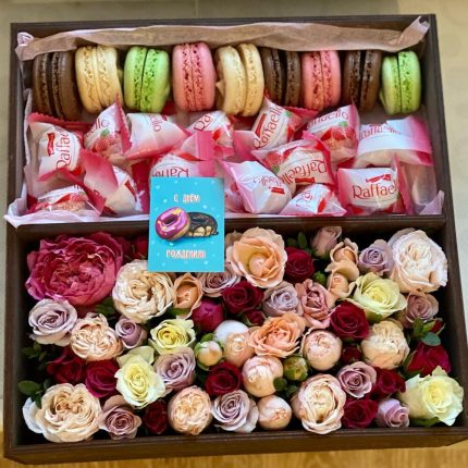 Сладости и цветы в деревянном ящике