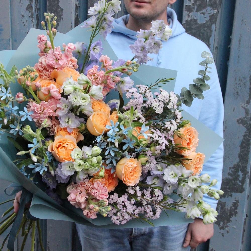 Роза пионовидная кустовая – 3 шт.Твидия – 4 шт.Ваксфлауэр – 3 шт.Маттиола – 4 шт.Эвкалипт – 5 шт.Упаковка дизайнерская – 2 шт.Лента атласная – 2 шт.Астранция – 2 шт.Дельфиниум – 3 шт.