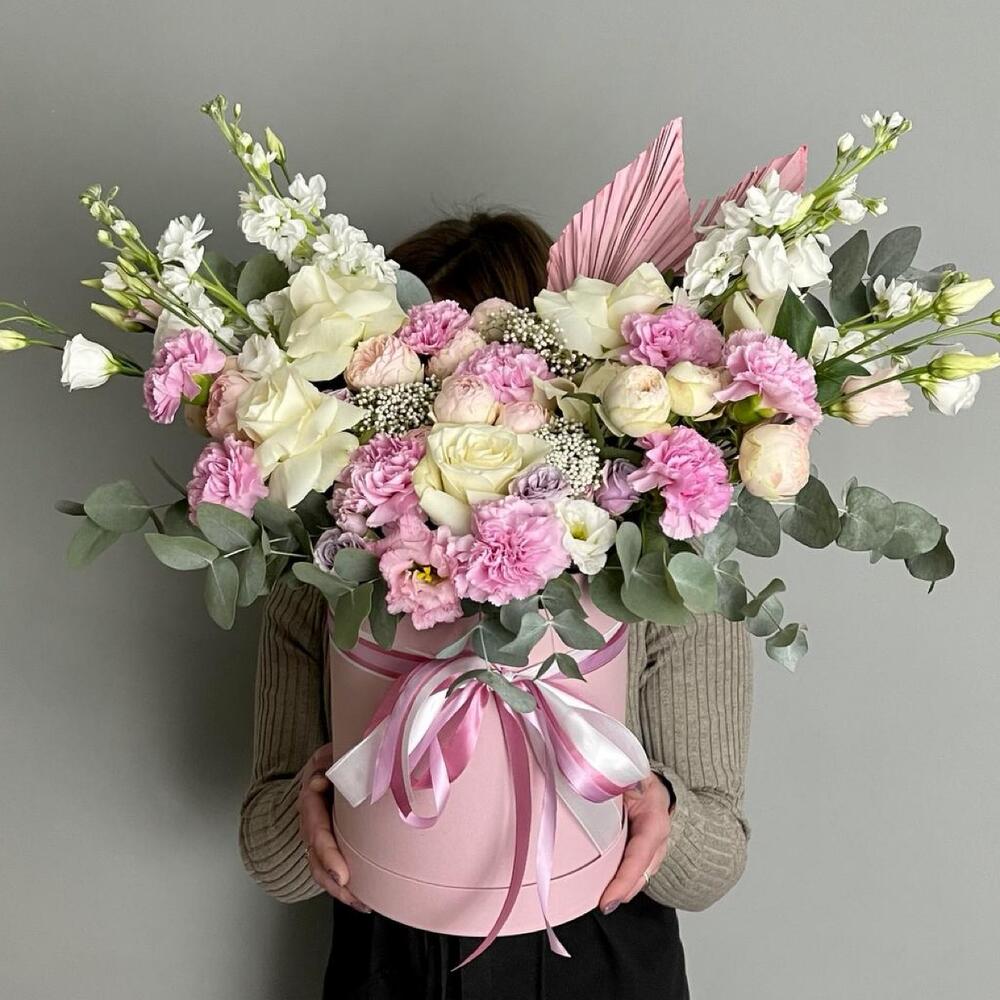 Маттиола – 4 шт.Лизиантус – 4 шт.Роза пионовидная кустовая – 5 шт.Роза – 5 шт.Озотамнус – 3 шт.Эвкалипт – 2 шт.Диантус – 9 шт.Роза кустовая – 1 шт.Лист пальмы – 2 шт.Оазис – 2 шт.Коробка шляпная – 1 шт.