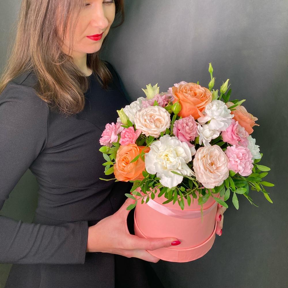 Роза Эквадор – 3 шт.Роза кустовая – 2 шт.Лизиантус – 2 шт.Диантус – 3 шт.Шляпная коробка – 1 шт.Оазис флористический – 1 шт.