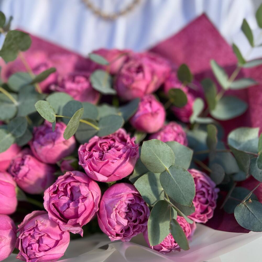 Эвкалипт – 2 шт.Лента атласная – 1 шт.Тишью – 2 шт.Пленка матовая – 1 шт.роза мисти бабл – 7 шт.