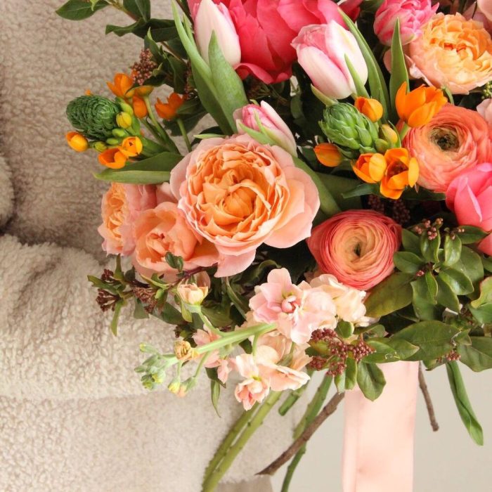 Авторский букет с пионами, ранункулюсами, тюльпанами, маттиолой и кустовыми пионовидными розами.