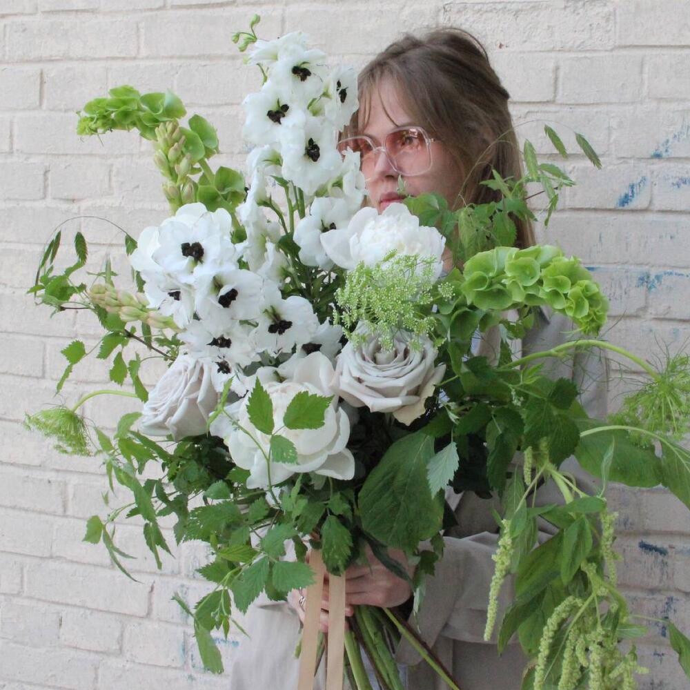 дельфиниумом – 3 шт.Амарант – 1 шт.ирландский колокольчик – 2 шт.Ветки малины – 4 шт.Тубероза – 2 шт.Роза Мента – 2 шт.Пион – 3 шт.Амми – 3 шт.Фисташка – 3 шт.Лента атласная – 1 шт.
