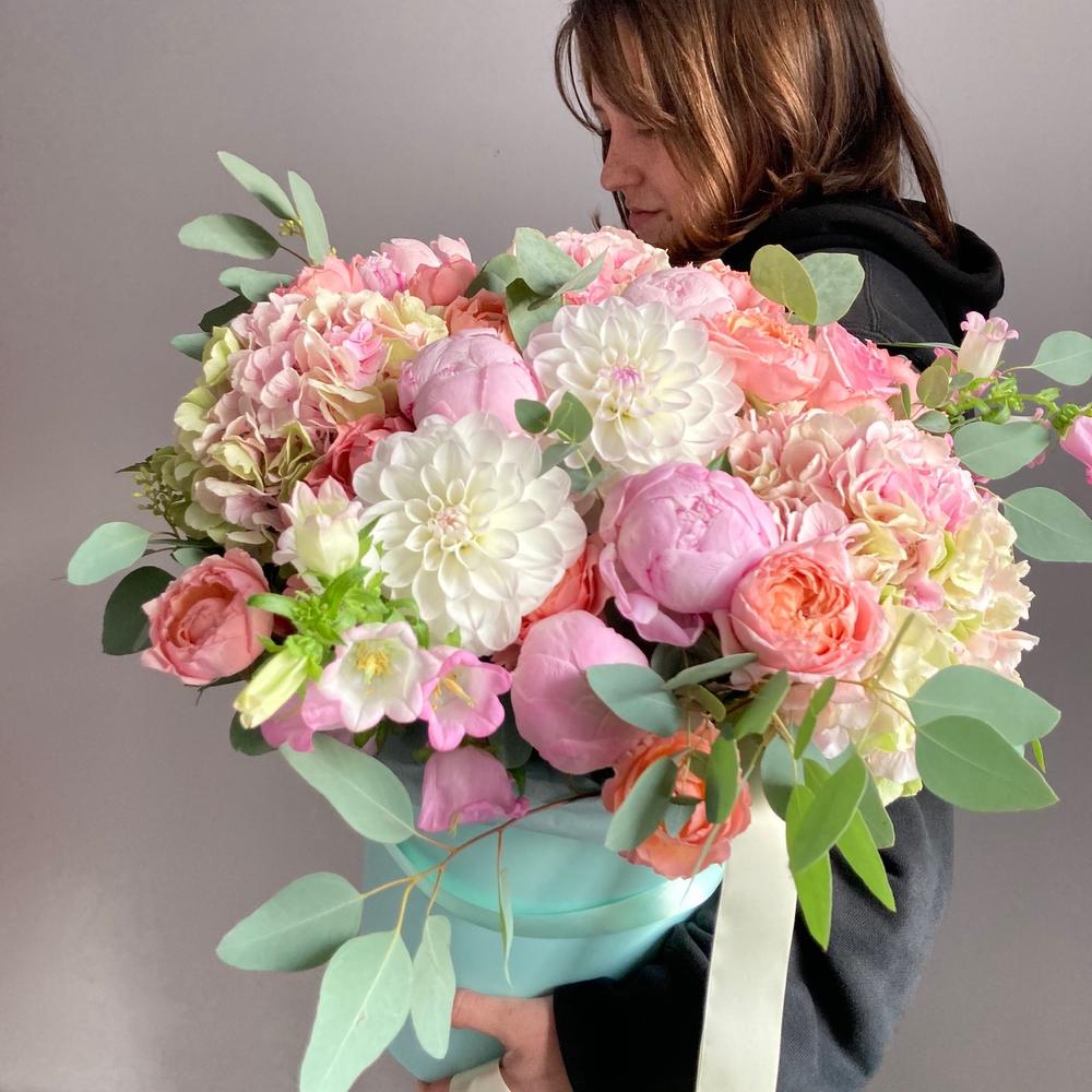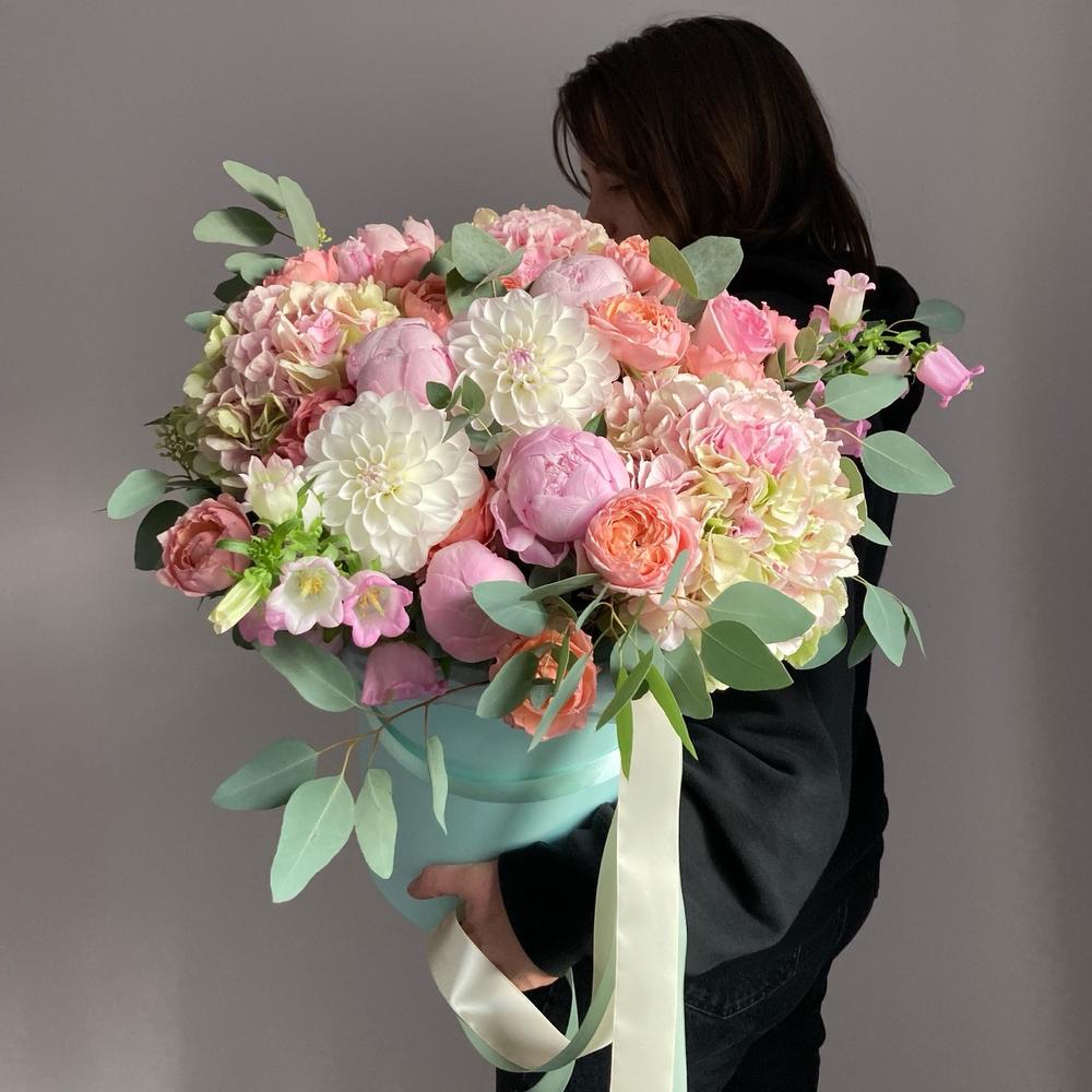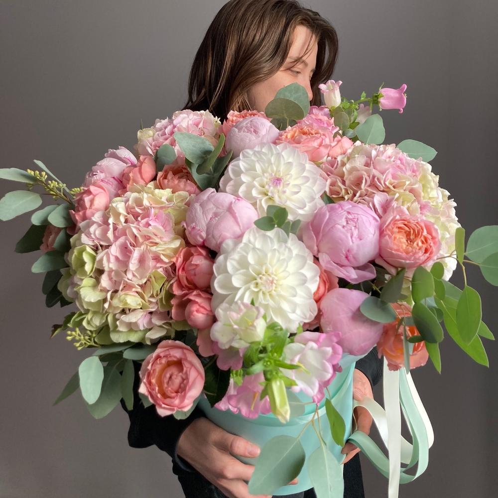 Гортензия – 3 шт.Роза кустовая пионовидная – 7 шт.Роза пионовидная – 5 шт.Колокольчик – 5 шт.Георгина – 3 шт.Эвкалипт – 5 шт.Шляпная коробка – 1 шт.Лента атласная – 2 шт.Тишью – 2 шт.Оазис флористический – 2 шт.