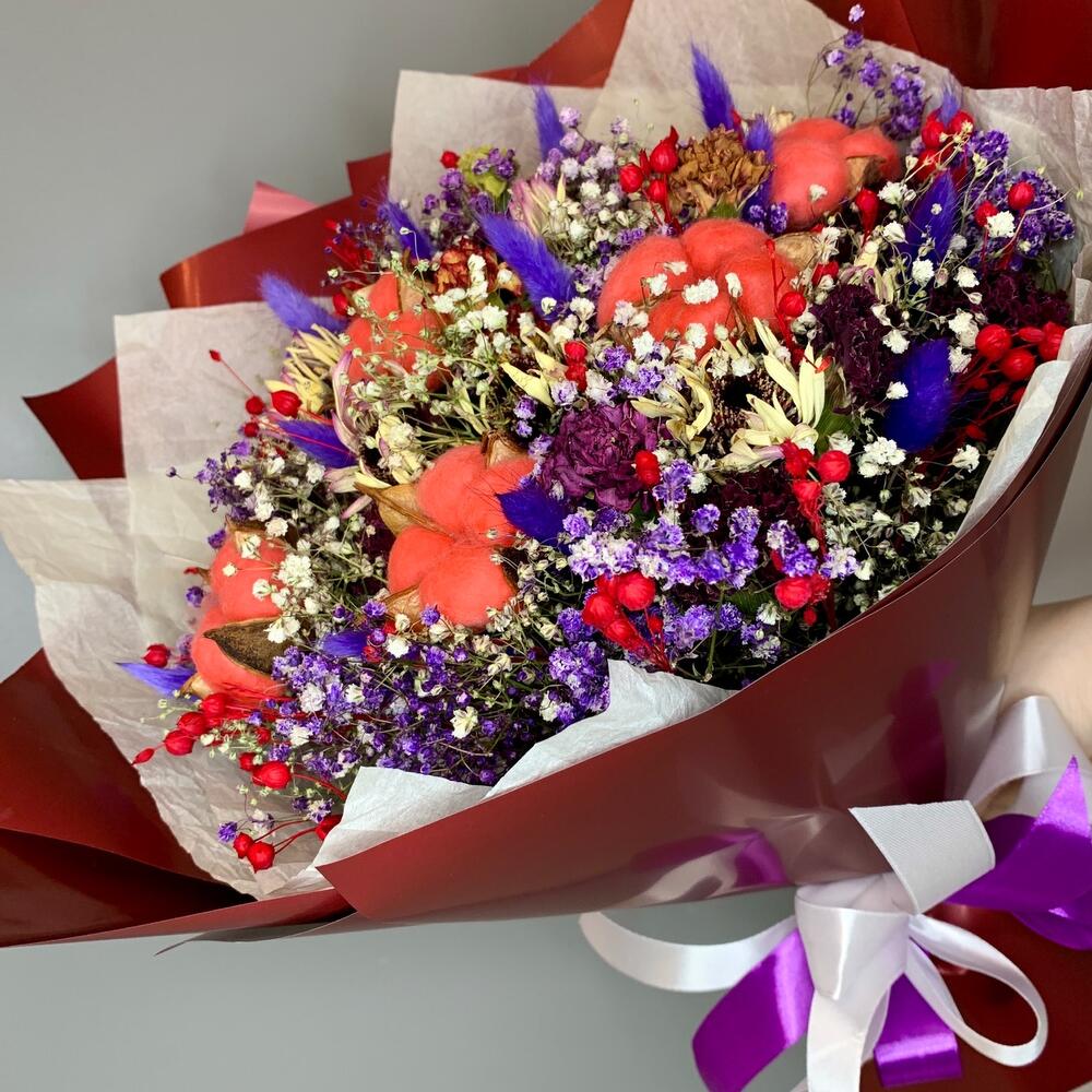 Хлопок – 7 шт.Лента атласная – 3 шт.Тишью – 2 шт.Лагурус (сухоцвет) – 15 шт.Дизайнерская упаковка – 4 шт.гипсофила сухоцвет – 15 шт.цветы сухоцветы – 25 шт.абрус сухоцвет – 30 шт.